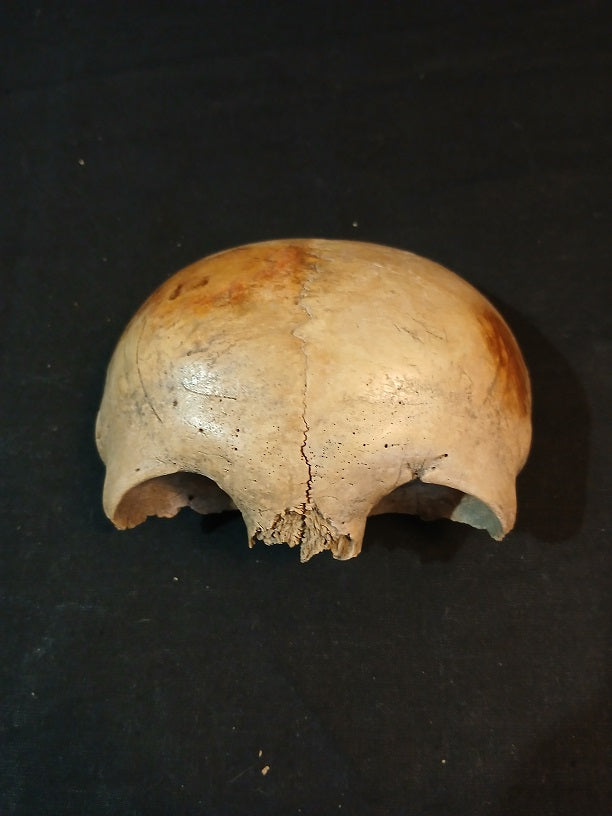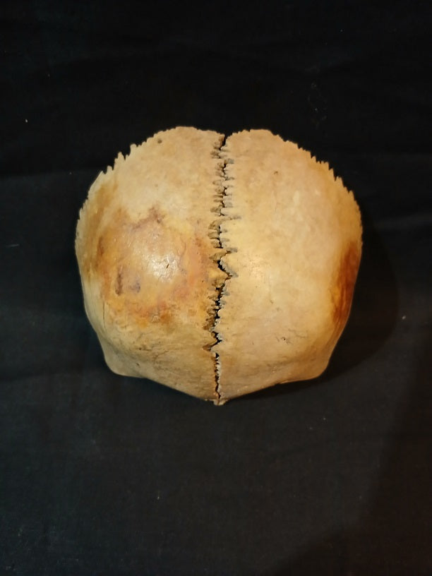 This is an interesting item. This is a nice example of a frontal bone with a lovely deep bone colour and rich patina. This is very unusual in that it shows a persistent metopic suture. It has a prevalence of about 4% in females and about 2% in males. Usually, this would have fused between three and nine months of age.