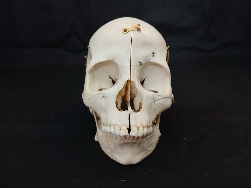 This is a rare item and in great condition. A medically prepared real human skull that has been cut away and has hinged segments that show the sinuses and also the structures within the ear. The must have been prepared in the second half of the 20th Century as the brass fittings are a later style and the skull still have a very white colour.