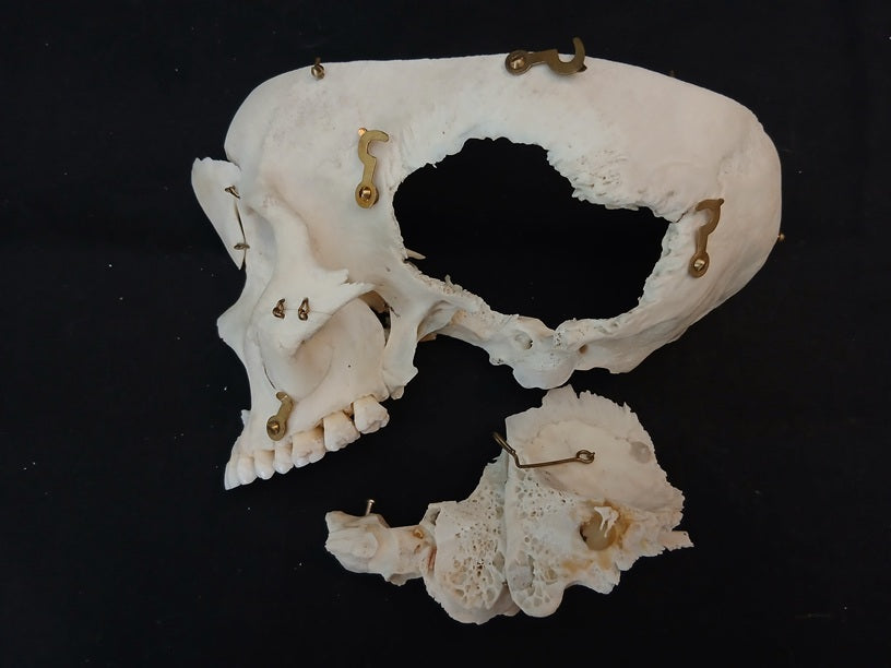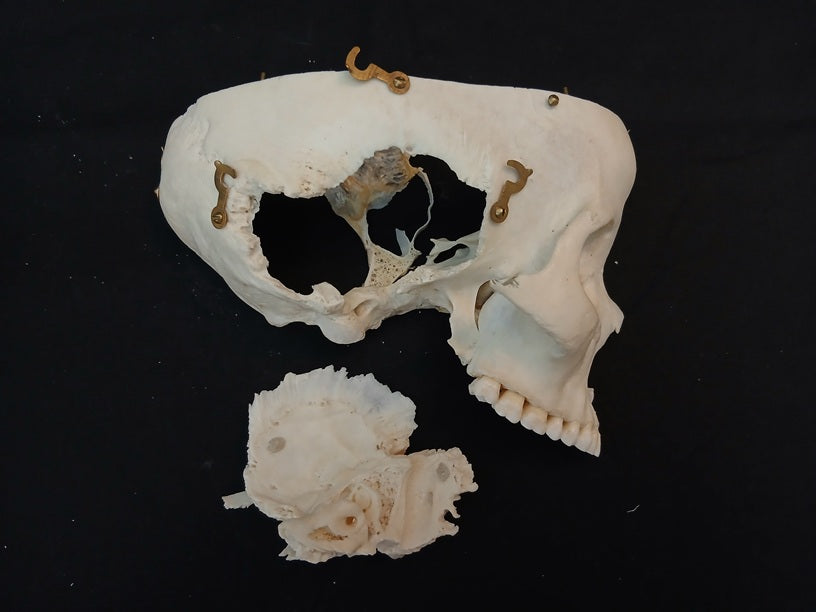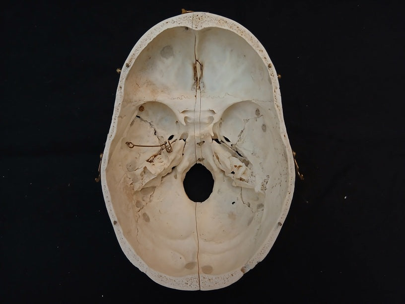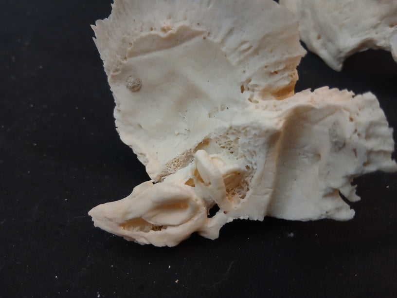 The cranium is removable and held on with hooks. The base of the skull has also been divided along the median line so that it opens into two halves. The right temporal bone can be removed and is sectioned to show the semi-circular canals. The left maxillary sinus can be opened with a hinged flap as can the frontal sinus. The left temporal bone can also be removed and splits into two pieces to show the eardrum and the malleus, incus and stapes.