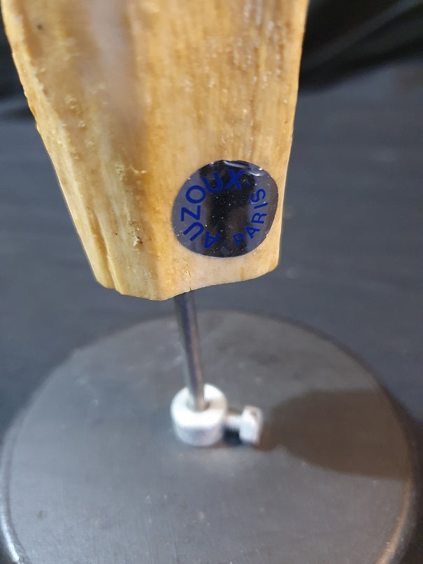 The whole structure has been mounted on a black wooden base. The Auzoux label is also present on the tibia and there is also a faint Auzoux stamp. The bone has a slight gloss finish and appears to have had a coat of varnish or similar although this may have been original to prevent the bone from crumbling and could be easily removed with acetone.
